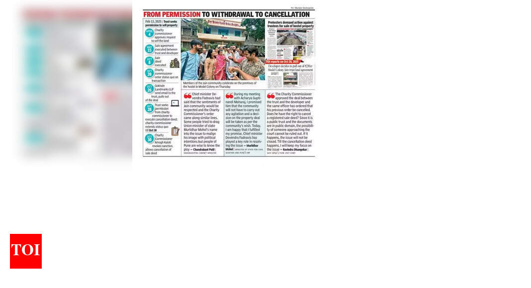 पुणे: महाराष्ट्र राज्य धर्मादाय आयुक्त अमोघ कलोती यांनी गुरुवारी मॉडेल कॉलनीतील सेठ हिराचंद नेमचंद स्मारक ट्रस्टच्या मालकीच्या 3.5 एकर मालमत्तेच्या पुनर्विकासाची 4 एप्रिल 2025 रोजीची मंजुरी रद्द करण्याचा आदेश काढला. या आदेशाने विश्वस्त आणि गोखले लँडमार्क्स एलएलपी यांना विक्री डीड आणि पॉवर ऑफ ॲटर्नी रद्द करण्याची परवानगी दिली. कलोती यांनी ट्रस्टला विक्री करार रद्द झाल्यानंतर विकासकाला 230 कोटी रुपये परत करण्याचे निर्देश दिले. जैन समुदायाने ट्रस्टच्या निर्णयावर आक्षेप घेतल्यानंतर हा करार वादात सापडला आणि दोन आठवडे आंदोलने झाली. आवारात वसतिगृह आणि जैन मंदिर/प्रार्थना हॉल आहे.करार रद्द न केल्यास जैन धर्मगुरू आचार्य गुप्तीनंदी महाराज यांनी 1 नोव्हेंबरपासून बेमुदत उपोषणाला बसण्याच्या आवाहनादरम्यान, ट्रस्ट आणि विकासक या दोघांनीही धर्मादाय आयुक्तांना करारातून माघार घेण्याचे त्यांचे इरादे सांगितले.त्यांच्या प्रतिज्ञापत्रांच्या आधारे, कलोती यांनी आदेश जारी केला, त्यांना विक्री करार रद्द करण्याची प्रक्रिया सुरू करण्याची परवानगी दिली. “महाराष्ट्र सार्वजनिक न्यास अधिनियमाच्या कलम 36 (2) अंतर्गत अधिकार वापरताना, 4 एप्रिल 2025 रोजी मंजूर केलेला आदेश याद्वारे रद्द करण्यात आला आहे,” असे आदेशात म्हटले आहे.धर्मादाय आयुक्तांनी ट्रस्ट आणि विकासकाला लवकरात लवकर विक्री डीड आणि पॉवर ऑफ ॲटर्नी रद्द करण्यासाठी पावले उचलण्यास सांगितले. ट्रस्टला विक्री मोबदल्याची संपूर्ण रक्कम विकसकाला परत करण्याचे निर्देश देण्यात आले होते, जे अंदाजे 230 कोटी रुपये आहे.आंदोलन सुरू ठेवणाऱ्या जैन समाजाच्या सदस्यांनी समाधान व्यक्त केले. माजी विद्यार्थी आणि आंदोलक अक्षय जैन यांनी TOI ला सांगितले, “हा केवळ जैन समाजाचाच नाही तर पुण्यातील लोकांचाही विजय आहे ज्यांनी आम्हाला पाठिंबा दिला. हा एक ऐतिहासिक आदेश मानला जाईल ज्यामुळे लोकांना सार्वजनिक ट्रस्टच्या जमिनीचे रक्षण करण्यात मदत होईल. हा एक कठीण लढा होता, परंतु आम्हाला आनंद आहे की न्याय मिळाला आणि आम्ही ट्रस्टची मालमत्ता वाचवू शकलो.माजी खासदार राजू शेट्टी आणि एमव्हीए सदस्यांसह विरोधकांनी, शिवसेना पुणे युनिटचे प्रमुख रवींद्र धंगेकर यांच्यासह केंद्रीय नागरी विमान वाहतूक राज्यमंत्री आणि पुण्याचे खासदार मुरलीधर मोहोळ आणि विकासक विशाल गोखले हे व्यावसायिक भागीदार असल्याने या करारात सहभागी असल्याचा आरोप केला होता. या आठवड्याच्या सुरुवातीला मोहोळ यांनी ट्रस्टच्या वसतिगृहात आचार्य गुप्तीनंदी महाराज यांची भेट घेतली.या आदेशानंतर धर्मगुरू म्हणाले, “हा संपूर्ण समाजाच्या ऐक्याचा विजय आहे. जे काही घडले ते आता भूतकाळात आहे आणि आपण 
